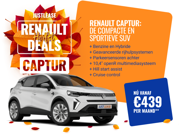 *Vanafprijs betreft een Renault Clio Evolution o.b.v. 60 maanden & 12.000 km/jaar. **Prijzen o.b.v. 60 maanden & 12.000 km/jaar en kunnen variëren afhankelijk van de gekozen looptijd, kilometrage, uitvoering en eventuele aanvullende opties. Actie geldig tot en met 30 november 2025. Afbeeldingen kunnen afwijken van daadwerkelijke specificaties. Wijzigingen en typefouten voorbehouden. Bekijk al onze voorwaarden hier.