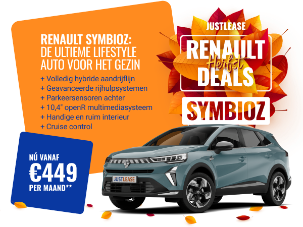 De Renault Symbioz is meer dan een auto, het model laat een auto en de toekomst samenkomen. Met de nieuwste technologieën en het uitgesproken design is de Symbioz een echt pronkstuk op wielen. Met de Symbioz ervaar je een nieuwe dimensie van rijden, waarin slimme systemen en nieuwe designs samenkomen. De Symbioz heeft talloze mogelijkheden waaronder een panoramisch dak, een schuifbare achterbank; tot wel 16 centimeter extra flexibiliteit. En... het allermooiste? Voor maar €10,- extra per maand kun je al profiteren van deze luxe! Stap flexibel in vanaf €449,- per maand!